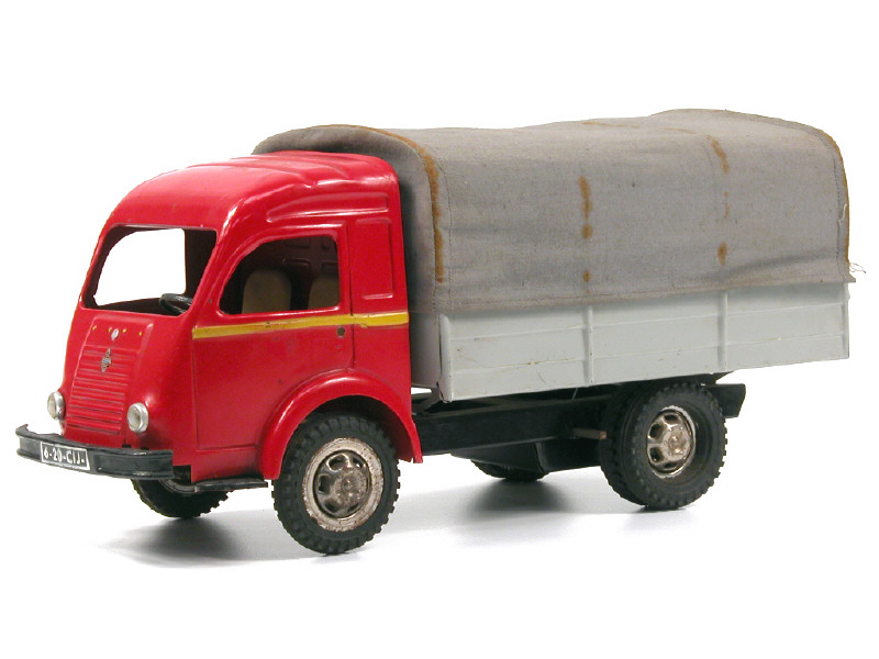 longueur 32 cm - moteur à clef (fonctionne) - avec direction - modèle de 1960 - très légères traces d'oxydation sur les jantes & quelques parties de bâche - 2 perforations non d'origine sur les portières - petits décalques ajoutés sur la ridelle arrière