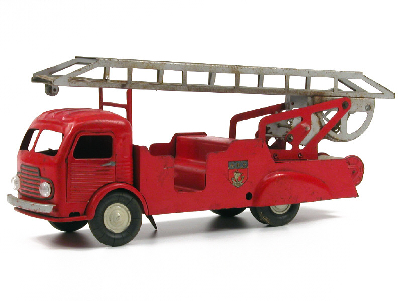 longueur 43 cm - moteur non d'origine - phares électriques (à revoir) - manque pompiers & ficelle d'échelle - retouches - pneus craquelés - petites traces d'oxydation