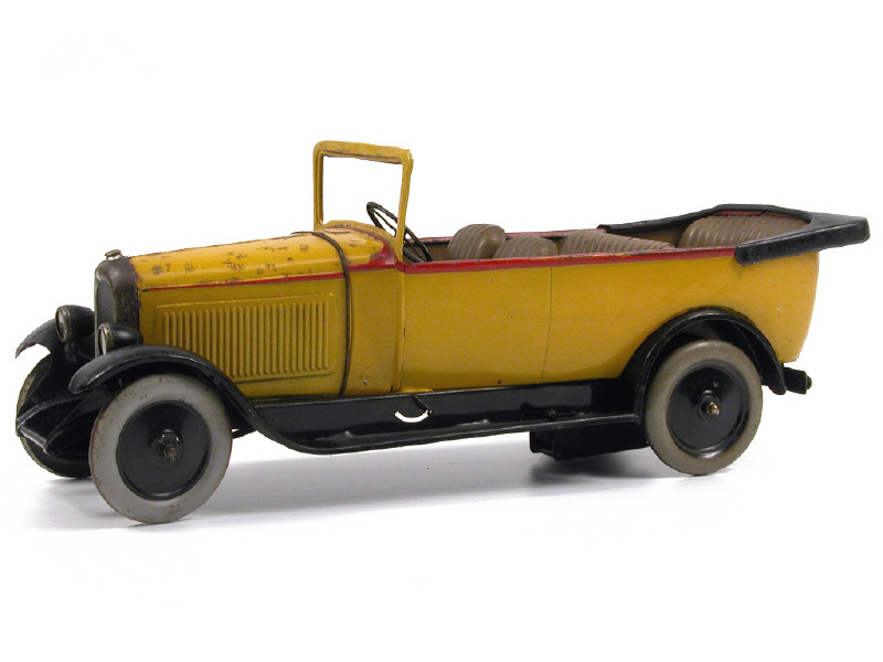 longueur 39 cm - moteur à clef (fonctionne) - échelle 1/10ème - version sans pare-soleil & avec roues en tôle - petites retouches - capote & banquette arrière repeintes - fixations de capote, bouchon de radiateur & banquette centrale non d'origine - traces d'oxydation - TRES BEL ASPECT GENERAL !