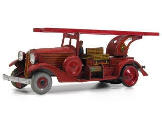 longueur 44 cm - moteur à ressort (à revoir) - roues arrière, échelle & quelques fixations non d'origine - parties repeintes - manque 2 pompiers - traces d'oxydation