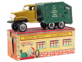 longueur 26 cm - moteur à clef (fonctionne) - quelques parties nickelées ternies - un décalque ajouté - roue de secours non d'origine - boîte avec inscription au tampon 'CAMION BRASSEUR'