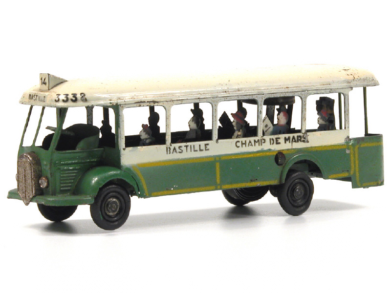 'BASTILLE - CHAMP DE MARS' - longueur 22,5 cm - fabrication de 1937 - moteur à clef (fonctionne) - le conducteur & le contrôleur sont en bois peint - les passagers sont en tôle peinte au pochoir - traces d'oxydation - manque conducteur - petites retouches - pneus craquelés dont un affaissé