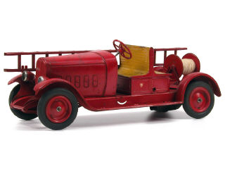 longueur 41 cm - moteur à clef (fonctionne de manière aléatoire) - direction par le volant - parties repeintes - volant & un support d'échelle non d'origine - traces d'oxydation