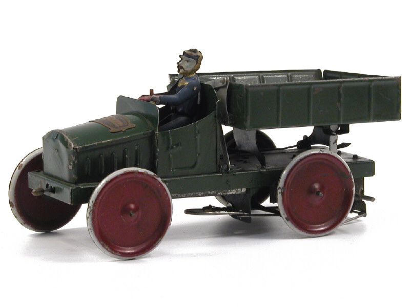 longueur 21 cm - moteur à ressort (à revoir) - avec conducteur & direction - inscription 'CHARGE MAXIMA 500 Kos' au tampon à l'intérieur de la benne - quelques parties légèrement tordues - petites traces d'oxydation - BEL ASPECT GENERAL POUR UN MODELE AUSSI RARE !