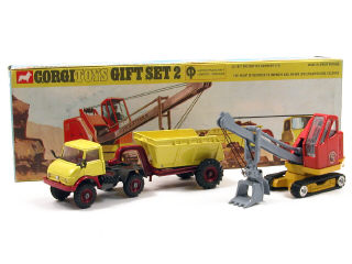 CORGI TOYS (GB) GS2 MERCEDES-BENZ UNIMOG 406 avec semi-benne basculante & pelleteuse PRIESTMAN orange, jaune & grenat
