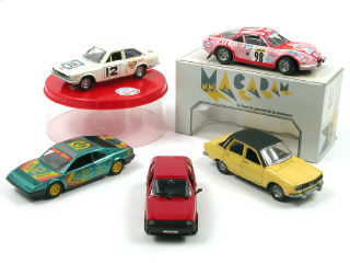 échelles de 1/20ème à 1/25ème - miniatures reproduisant les modèles : RENAULT, ALPINE RENAULT, SEAT, FERRARI & VOLKSWAGEN - on y retrouve les marques : GUISVAL, POLISTIL & MACADAM - un modèle en état 'C' & 2 autres avec boîte