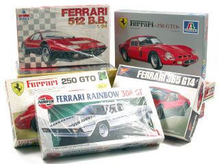 comprend les modèles : 250 GTO (2 exemplaires différents), 308 GT RAINBOW, 365 GT4, 348 TB, 512 BB, 308 GTB, TESTAROSSA, SWB & 250 GT - on y retrouve les marques : AIRFIX, PROTAR, ITALERI, NICHIMO, ESCI, REVELL & TAMYA - 5 boîtes sous plastique jamais ouvert