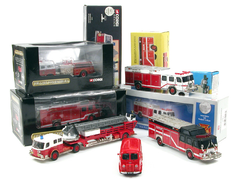 miniatures reproduisant notamment les modèles : E-ONE (manque 2 projecteurs sur un véhicule, un rétroviseur cassé sur un autre), AMERICAN LA FRANCE, CHEVROLET, MACK & PEUGEOT