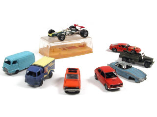états de 'B' à 'F' - miniatures reproduisant les modèles : RENAULT, FIAT, BERLIET, MERCEDES, DODGE, MATRA & LOTUS-CLIMAX - on y retrouve les marques : MINIALUXE, MEBETOYS, CLE, SESAME, QUIRALU, FRANCE JOUETS & POLITOYS - un modèle avec boîte - conditions 'B' to 'F' - miniatures of the aforementioned models