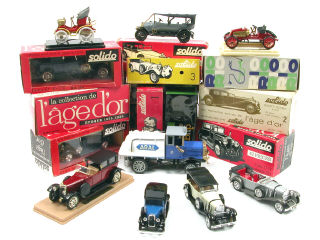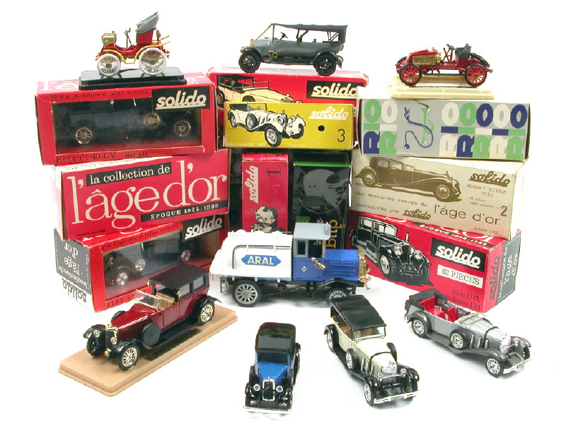 miniatures reproduisant les modèles : MERCEDES, PANHARD & LEVASSOR, FIAT, RENAULT, VOISIN, HISPANO SUIZA, BUGATTI, GREGOIRE, HENSCHEL & PEUGEOT- on y retrouve les marques : RIO, ZISS-MODELL, SOLIDO, DUGU & SAFIR - 3 boîtes en état 'c' - une fixation de capote cassée sur une FIAT - manque une roue de secours sur la GREGOIRE - traces d'humidité sur une boîte - un modèle en état 'C' & un autre 'B'