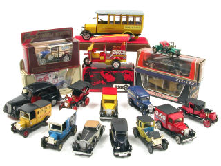 miniatures reproduisant notamment les modèles : FORD, AUSTIN, MERCEDES, RENAULT, LANCHESTER, FIAT, MAGIRUS & HORCH - on y retrouve notamment les marques : CEF, MATCHBOX, LUCKY, IDEA 3, MINIALUXE, ELIGOR & GUISVAL - 8 véhicules avec boîte - manque un phare sur une voiture, un plancher fendu & recollé sur une autre