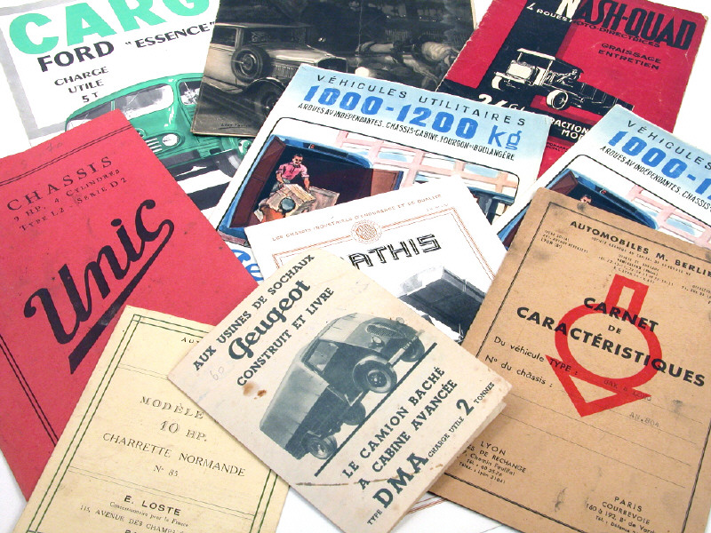 comprend des véhicules utilitaires des marques : PEUGEOT, FORD, FIAT, UNIC, BERLIET, MATHIS & NASH-QUAD - éditions notamment des années 20 & 30 - un catalogue en état 'c'