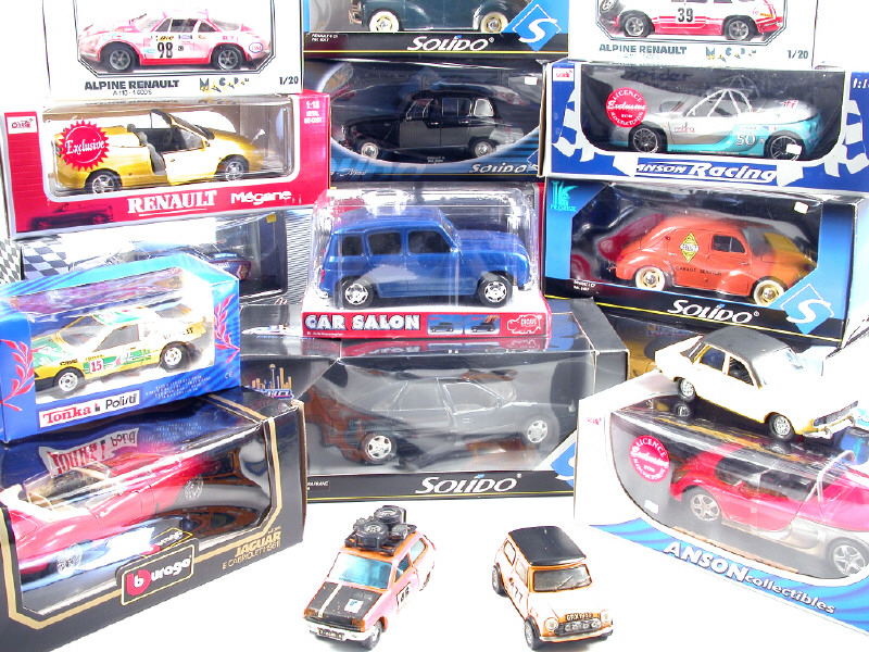 échelles 1/18ème à 1/25ème - miniatures reproduisant les modèles : RENAULT, AUSTIN, JAGUAR, ALPINE & CHEVROLET - on y retrouve les marques : SOLIDO, POLISTIL, DICKIE, MACADAM, HOT WHEELS, NACORAL, GUISVAL, ANSON, MAISTO & POLITOYS - 3 voitures sans boîte dont une en état 'C' & 2 en états 'B'