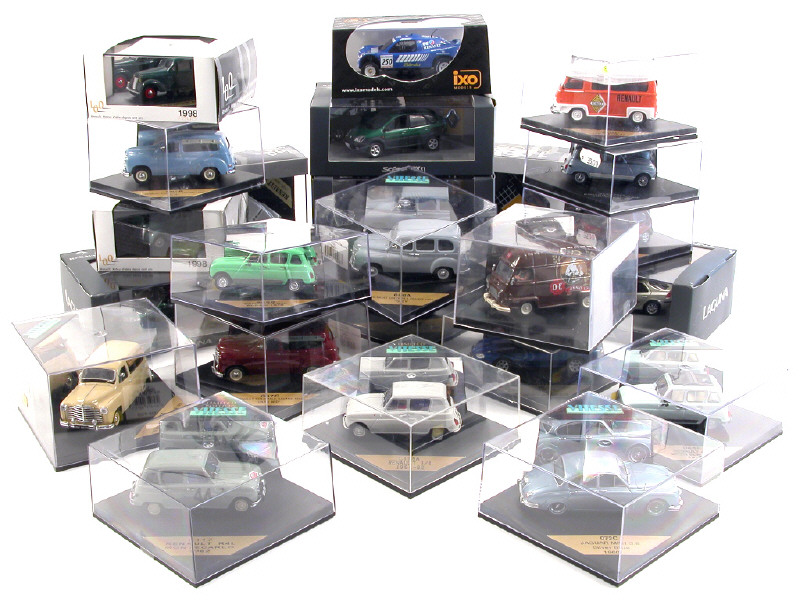 comprend : COLORALE (4 exemplaires), LAGUNA (3 exemplaires), JUVAQUATRE (3 exemplaires), ESTAFETTE (2 exemplaires), 4L (5 exemplaires), MEGANE (2 exemplaires), TWINGO, FUEGO, SCENIC & SAFRANE- on y retrouve les marques : VITESSE, CITY, XYO, NOREV, ELIGOR & UNIVERSAL HOBBIES - on y joint une JAGUAR MK II & une JAGUAR XK8 - manque un rétroviseur sur un modèle - une boîte en état 'c'