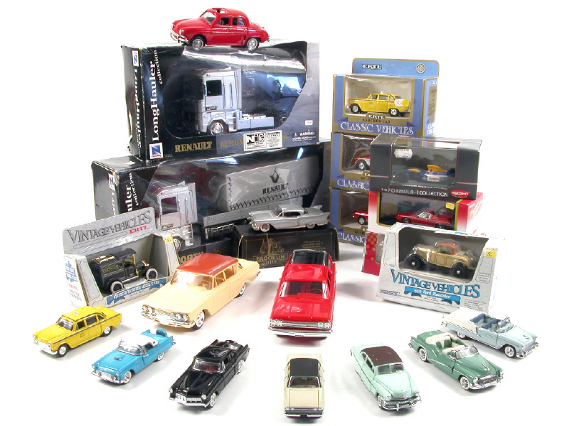 miniatures reproduisant les modèles : FORD, RENAULT (dont une voiture de circuit), LOTUS, WILLIAMS-RENAULT, CHEVROLET, CHECKER, CADILLAC, LINCOLN, MERCURY, BUICK & RAMBLER - on y retrouve notamment les marques : ERTL, KYOSHO, NINCO, NEWRAY, FRANKLIN MINT, BROOKLIN & HUBLEY - 10 modèles en boîte - 5 véhicules grandes échelles - petits manques sur quelques modèles