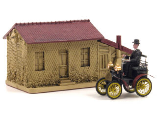 avec conducteur (vraisemblablement Louis RENAULT) & reproduction du premier atelier de l'inventeur