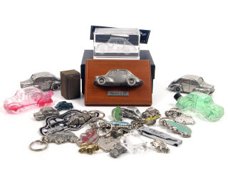 comprend : 8 porte-clés, 7 pin's, 2 bouteilles de parfum (dont une pleine), 2 tampons, 7 miniatures & 2 objets décoratifs - 4 objets en boîte - 2 pièces en état 'C'