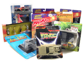 comprend : un dragster de la série 'THE MUNSTERS', une JEEP lunaire de la mission APOLLO XV, une DE LOREAN du film 'RETOUR VERS LE FUTUR', une FORD MUSTANG BOSS 351, un HUMMER POLICE du film 'ROBOCOP', une FORD TAURUS BATMAN, un van du JOKER, une FORD MUSTANG MACH 1, une PLYMOUTH SUPERBIRD, un set comprenant un side-car & des figurines du film 'INDIANA JONES' & un coffret LOONEY TUNES comprenant 6 personnages de cartoon - un modèle sans boîte & un autre en état 'C' - on y retrouve notamment les marques : ERTL, PLAYING MANTIS, REVELL & IDEAL
