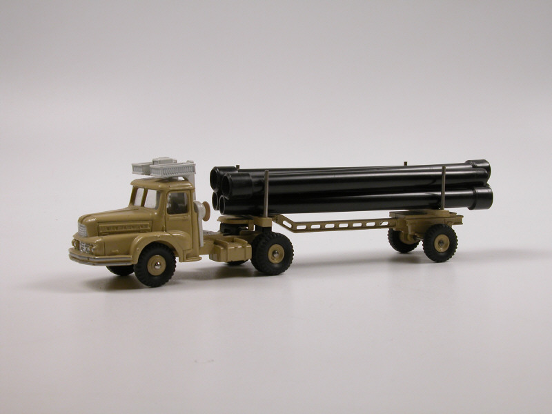 DINKY TOYS (FRANCE) 893 UNIC Saharien transport de pipe-lines (version avec jantes convexes & remorque ajourée) sable & blanc