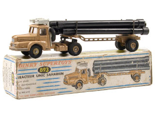 DINKY TOYS (FRANCE) 893 UNIC Saharien transport de pipe-lines (version avec jantes convexes & remorque ajourée) sable & blanc
