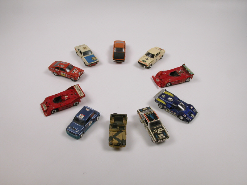 miniatures reproduisant les modèles : FERRARI, MARCH, MERCEDES AUTO UNION, OPEL, FORD, TOYOTA, RENAULT & PORSCHE - une voiture en état 'C' avec pare-brise rabattable cassé & incomplet - petits détails de peinture ajoutés sur 3 modèles & rétroviseurs manquant sur un autre