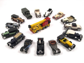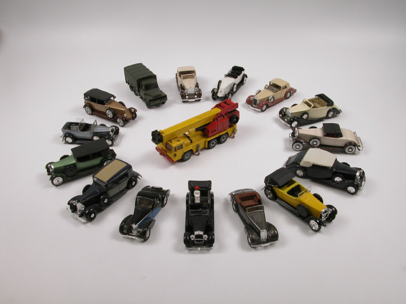 états de 'B' à 'C' - série 'AGE D'OR' - miniatures reproduisant les modèles : ROLLS ROYCE, RENAULT, FIAT, HISPANO SUIZA, DUESENBERG, BUGATTI, TALBOT & DELAGE - avec manques - on y joint un ACMAT bâché militaire de la marque VEREM & un FAUN KN grue de la marque SIKU