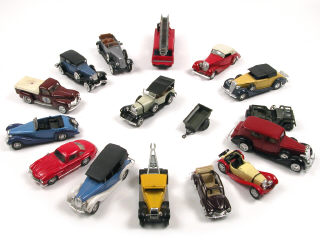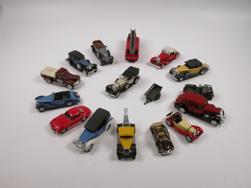 états de 'B' à 'C' - série 'AGE D'OR' - miniatures reproduisant les modèles : DODGE, MERCEDES, RENAULT, JAGUAR, DELAHAYE, PACKARD, CITROËN & CORD - avec manques - on y joint une JEEP militaire avec remorque & un BERLIET 770 KE CAMIVA grande échelle de pompiers