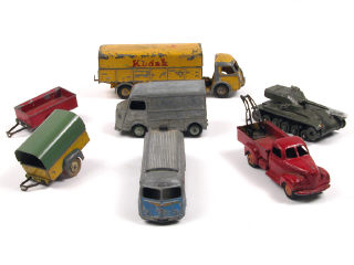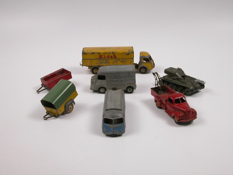 DINKY TOYS (FRANCE) Ensemble de 2 camions, 2 remorques, un char, une camionnette & un car