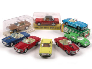 comprend les modèles : 230 SL (4 exemplaires), 300 SL, 350 SL (2 exemplaires) & C111 - 3 voitures avec boîte - manque une roue de secours sur un modèle