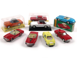 comprend les modèles : 230 SL (4 exemplaires), 300 SL, 350 SL (2 exemplaires) & C111 - 2 modèles avec détails de peinture ajoutés dont une avec volant non d'origine - 4 voitures avec boîte dont une avec bulle manquante