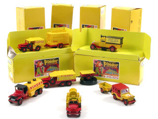 VEREM (FRANCE) Ensemble de 6 véhicules & 3 remorques du cirque PINDER rouge & jaune