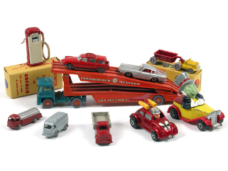 petites échelles - états de 'A' à 'E' - on y retrouve les marques : MATCHBOX, BESTBOX, PENNY, C.I.J., COFALU, MERCURY & LES ROUTIERS - 2 modèles avec boîte & un autre incomplet - small scales - from 'A' to 'E' conditions - includes the aforementioned makes - 2 models with box & an other incomplete