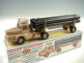 DINKY TOYS (FRANCE) 893 UNIC Saharien transport de pipe-lines (version avec jantes concaves & remorque ajourée) sable & blanc