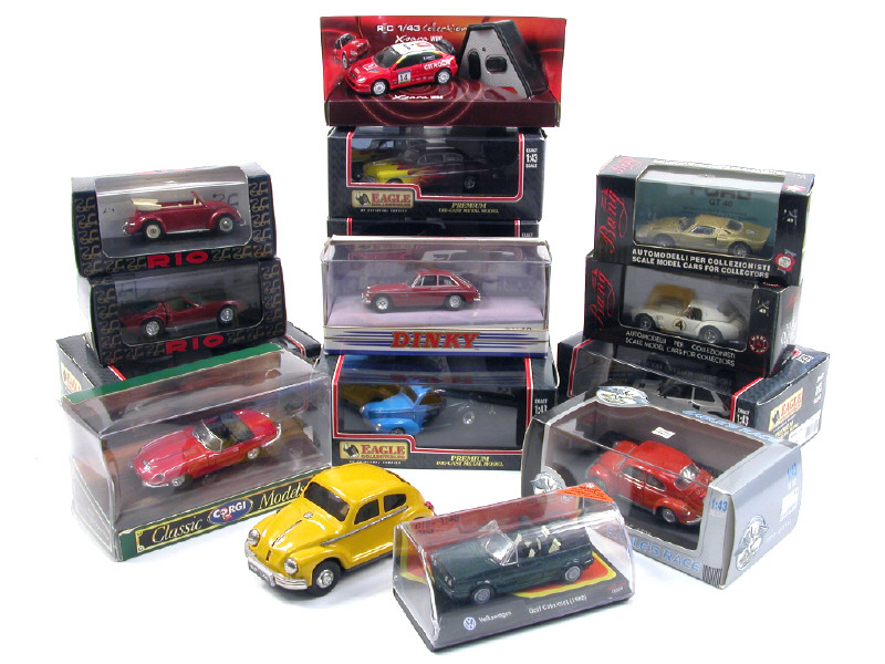 miniatures reproduisant les modèles : RENAULT, CITROËN, FORD, MERCURY, LAMBORGHINI, MG, BMW, JAGUAR, VOLKSWAGEN, COBRA, CHEVROLET, PORSCHE & WILLYS - on y retrouve notamment les marques : UNIVERSAL HOBBIES, BANG, RIO, NEW-RAY, DINKY TOYS, ANSON, CORGI TOYS & MAJORETTE
