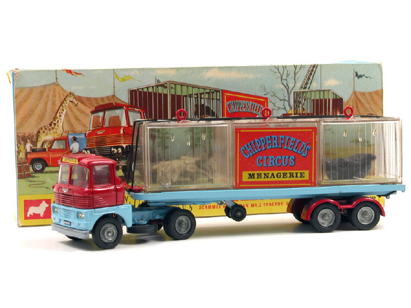 CORGI TOYS (GB) 1139 SCAMMELL HANDYMAN avec remorque-ménagerie rouge & bleu ciel