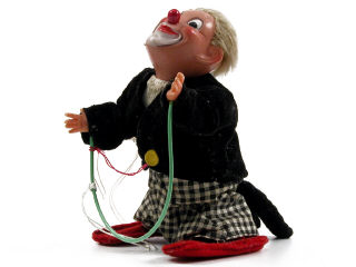 hauteur 15 cm - moteur à clef (fonctionne) - avec clef (non d'origine) - en action, le clown saute en arrière & retombe sur ses pieds (de manière aléatoire) - manque noeud papillon