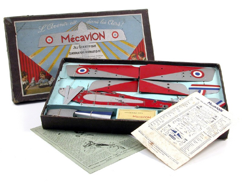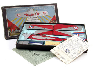dimensions : 23 x 43 cm - permet la construction de 7 modèles d'avions différents - avec notices (dont une non d'origine) - traces d'oxydation - manque vraisemblablement quelques pièces