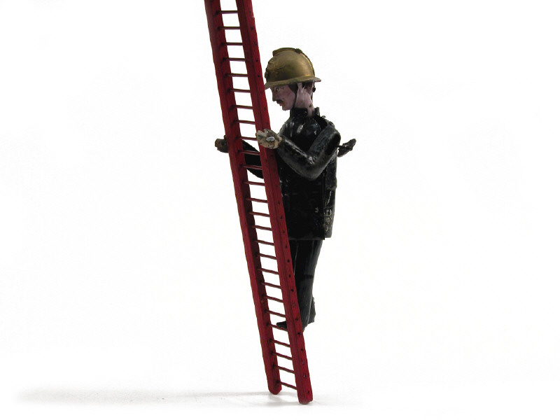 hauteur du pompier 20 cm - moteur à ressort (fonctionne) - en action, le pompier monte sur son échelle - manque plusieurs agrafes sur sa tenue - échelle & tête du personnage avec son casque repeints