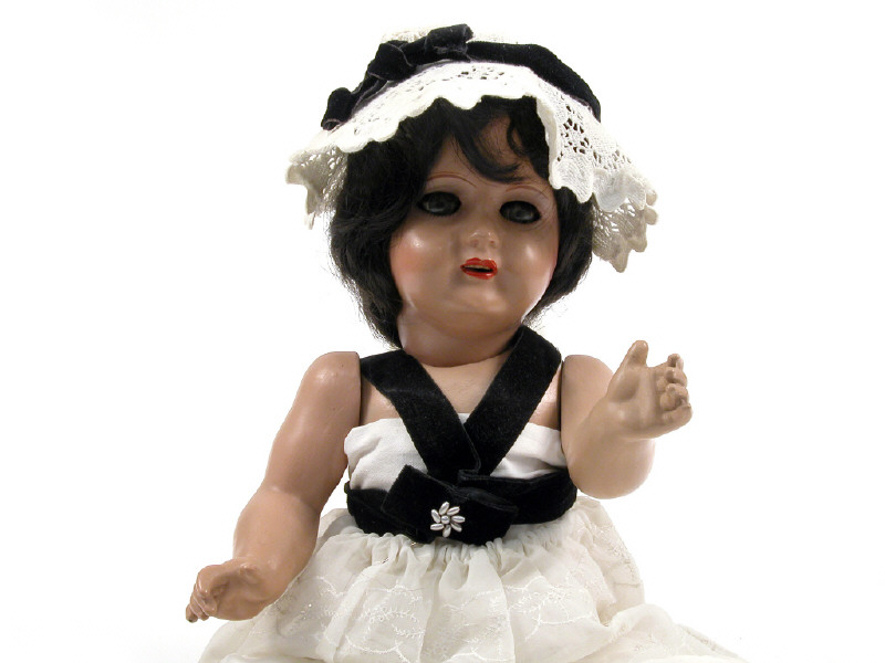 hauteur 52 cm - tête & corps articulés en composition, bouche ouverte sur une rangée de dents, yeux bleus mobiles, avec robe & dessous en dentelle - petits manques sur la tête