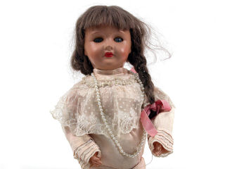 hauteur 59 cm - marquage en creux 'PARIS 301' - tête & corps articulés en composition, bouche fermée, yeux bleus mobiles, avec robe en dentelle - avec bruiteur - un manque sur un mollet