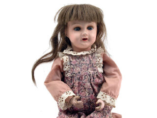 hauteur 51 cm - marquage en creux 8 - tête en biscuit & corps articulés en bois - bouche ouverte sur une rangée de dents désolidarisée de la bouche - yeux bleus mobile - avec robe - petits manques & fêlures