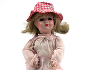 hauteur 51 cm - tête & corps articulés en composition, bouche ouverte sur une rangée de dents - yeux bleus mobiles, avec robe & dessous en dentelle - petites fêlure sur le visage avec léger manque sur le nez & un doigt