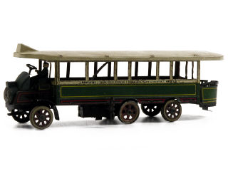 longueur 26 cm - moteur à ressort (à revoir) - fabriqué de 1923 à 1938 - direction couplée des essieux avant & arrière - toit repeint - traces d'oxydation - une roue non d'origine