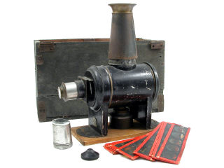 dimensions : 22 x 11 x 30 cm - éclairage par lampe à pétrole - le coffret comprend 12 plaques d'animation en verre coloré - avec quelques accessoires