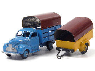DINKY TOYS (FRANCE) 25L STUDEBAKER Tapissière (avec cabine type 2 & roues à pneus 'M') bleu vif, jantes identiques, bâche marron