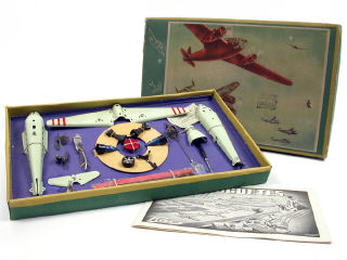 dimensions du coffret : 34 x 21 cm - contient différents éléments en tôle permettant la construction d'un avion bimoteur - toutes les pièces sont ficelées sur leur carton de présentation - avec notice & petite fiche de contrôle - SUPERBE !