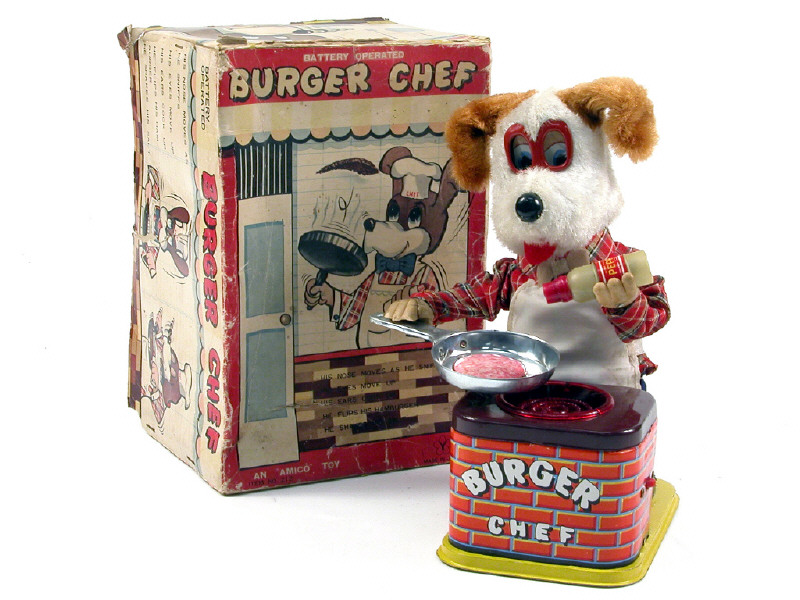 hauteur 23 cm - en action, le chien cuisine, poivre son plat & fait sauter le contenu de sa poêle - le fourneau s'allume - le cuisinier agite le museau, bouge les yeux & les oreilles - tous les mécanismes fonctionnent - main droite craquelée avec extrémités des doigts manquantes