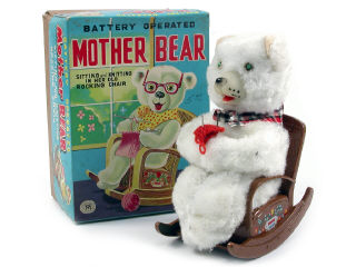 hauteur 24 cm - en action, maman ourse se balance sur son rocking-chair en tricotant tandis que ses yeux s'allument - tous les mécanismes fonctionnent - lunette manquantes
