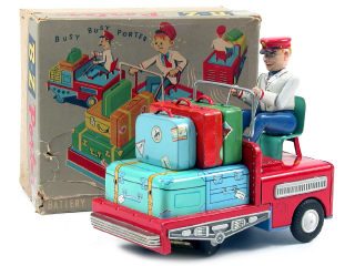 longueur 19 cm - en action, le porteur sur son véhicule avance tout en contournant les obstacles tandis que ses mains actionnent les manettes du chariot - tous les mécanismes fonctionnent - avec 3 valises en tôle lithographiée, élastique de maintien & cales de boîte
