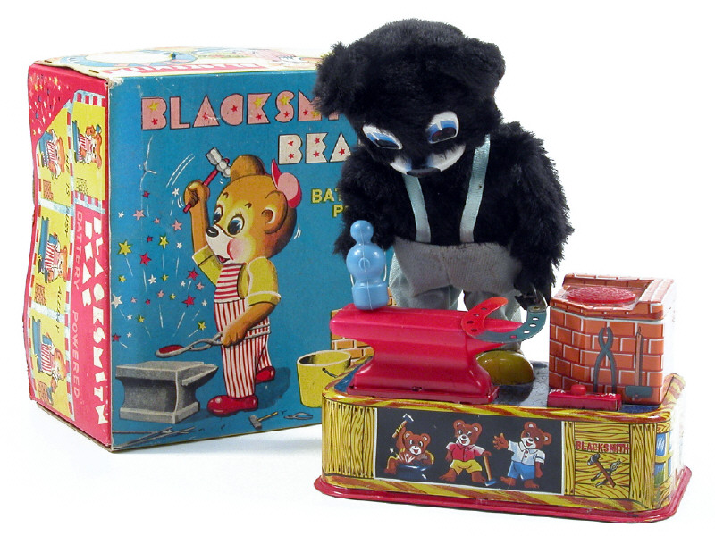 hauteur 24 cm - en action, l'ours frappe le fer à cheval sur son enclume, puis s'arrête - les yeux de l'animal, le foyer & l'enclume s'éclairent - tous les mécanismes fonctionnent